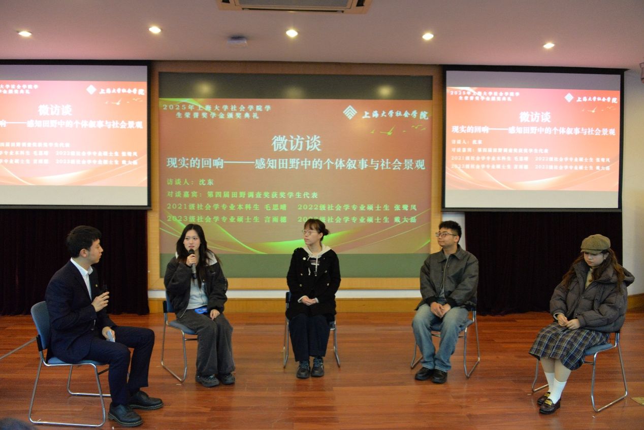 为进一步加深同学们对田野调查的理解和认识,主持人沈东老师与田野调查奖获奖员工代表进行了以“现实的回响——感知田野中的个体叙事与社会景观”为主题的微访谈。在谈到田野调查的关键能力时,毛思晴同学强调 “身临其境”与“置身事外”的平衡。她建议同学们保持好奇心和同理心,运用对比法分析熟悉或陌生的社会现象。张鹭凤同学分享了对“两头婚”研究的经验,提出进入田野时不能带着太强的目的性,而应与访谈对象建立信任,成为朋友。言雨穗同学探讨了数字化技术在田野调查中的运用,她认为,技术无法取代直觉,研究者需要保持开放和放松的心态。戴大磊同学则以“坎坷、快乐、感恩”三个词来总结自己的田野调查经历,回顾了面对研究挑战时的调整与收获。