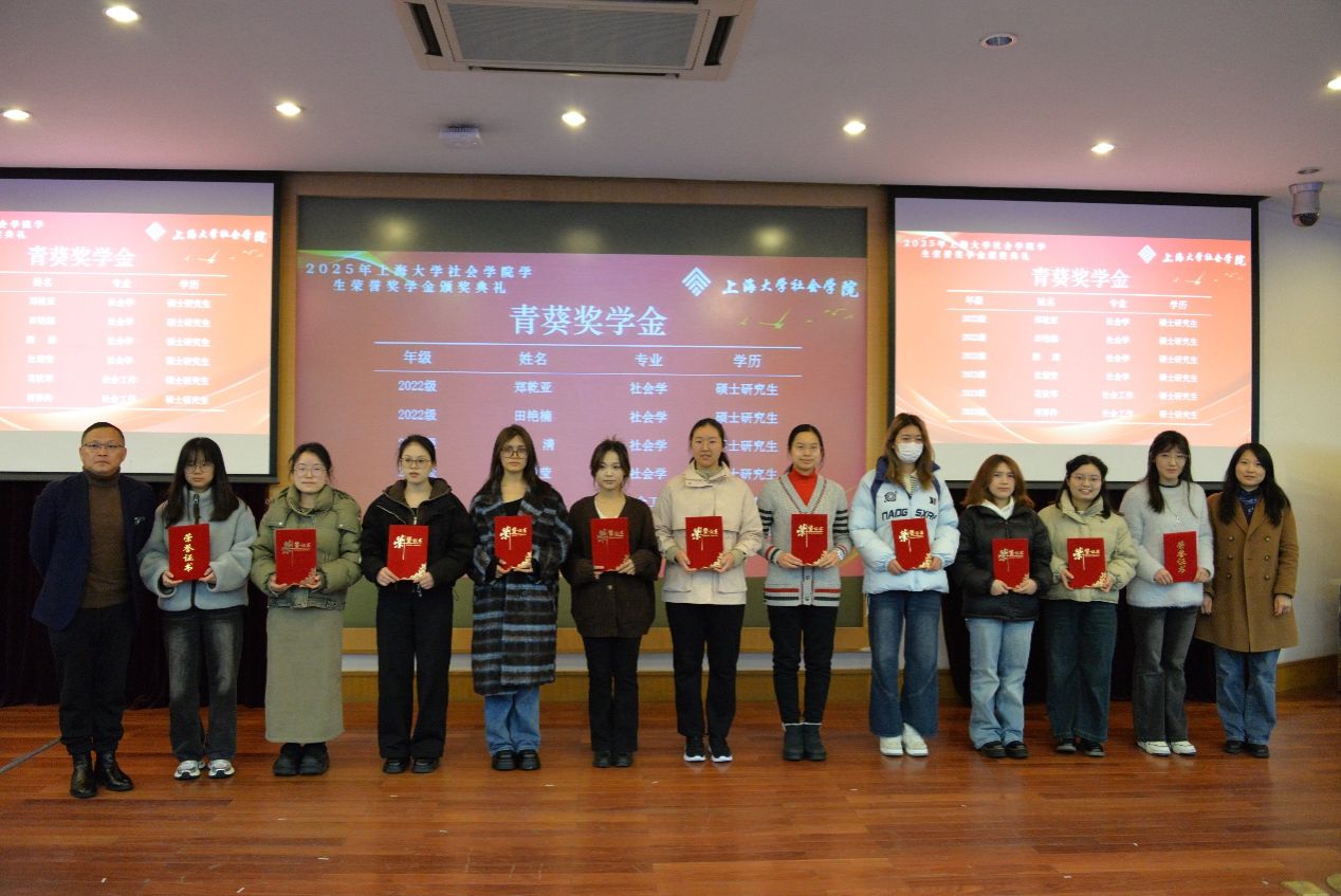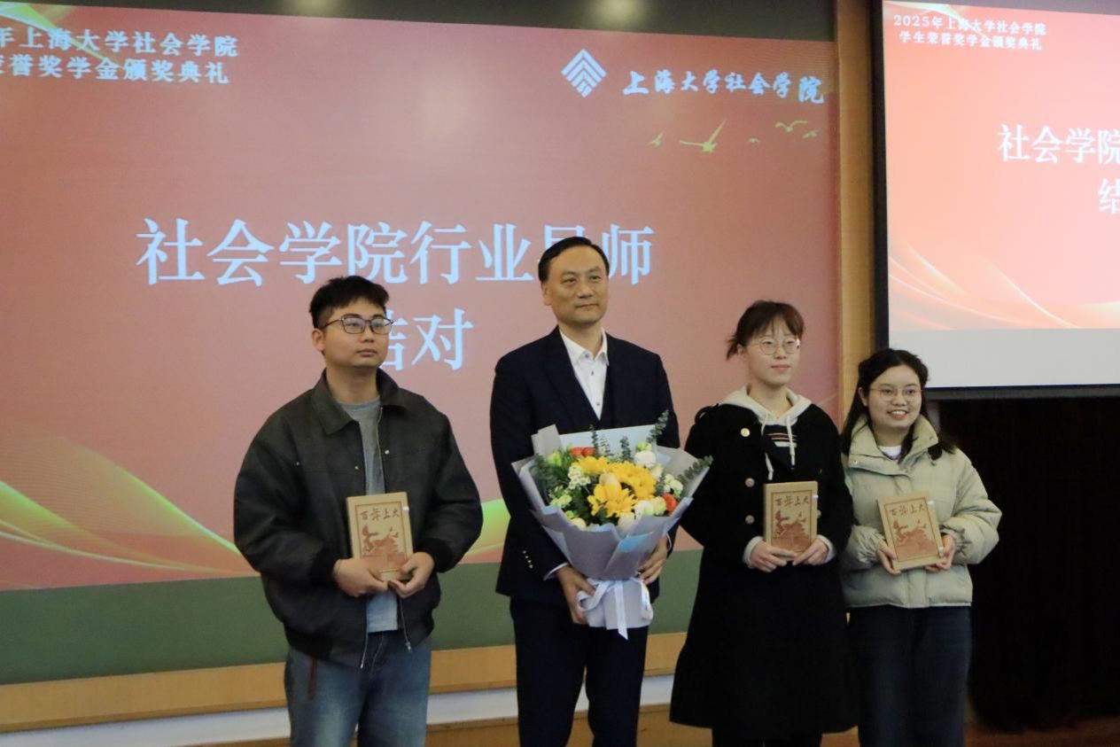 韩晶老师为邵靖雯、汪铭、黄焱堰等6位同学颁发邓伟志育才奖学金证书。