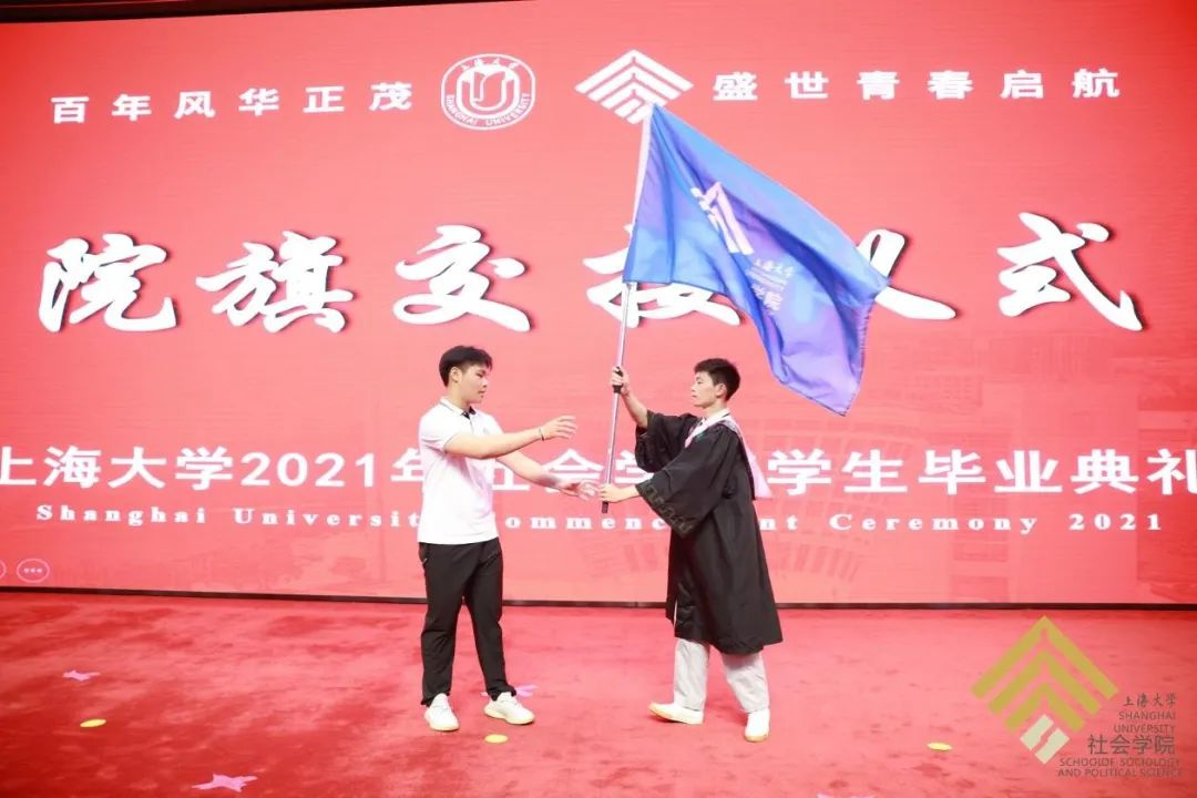 2017级本科生代表戴容成郑重地将院旗交给了2020级新生代表姚欣鹏,代表着一代代上大社院学子的新老交替,也希望“胸怀祖国、放眼世界,心系社会,志在利民”的院训精神能够在社院学子心中不断传承。