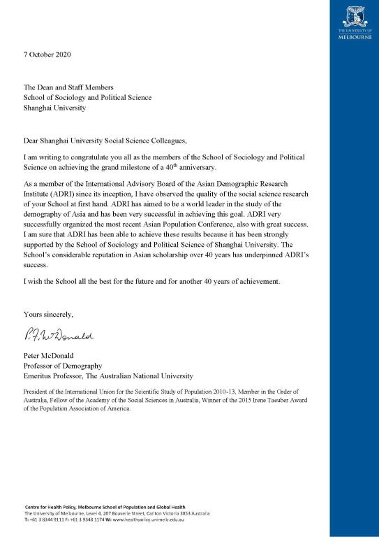 贺信——澳洲国立大学Prof. Peter McDonald教授