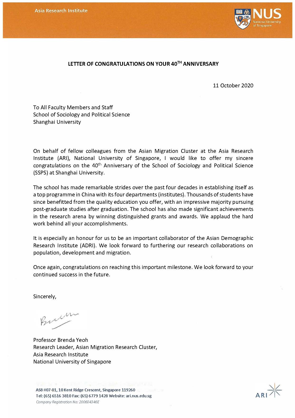 贺信——新加坡国立大学亚洲研究所
