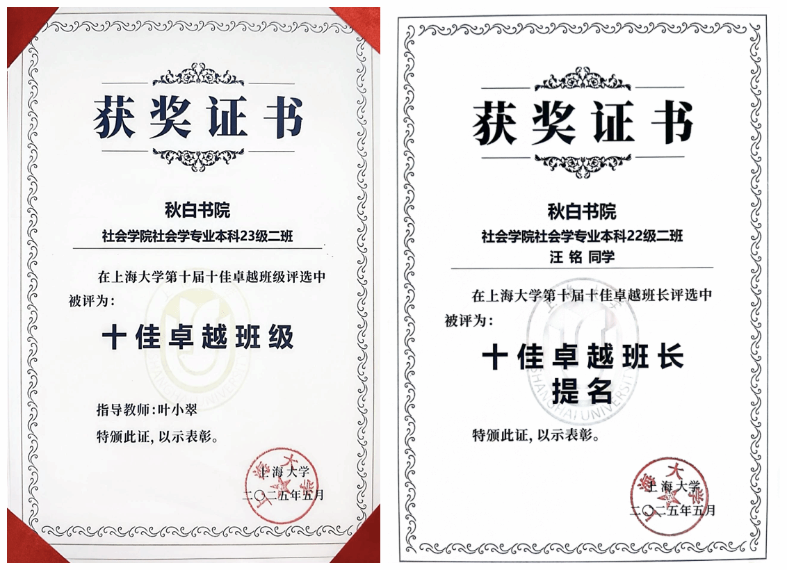2025年5月11日,“融汇青衿班韵 共谱书院华章”3044永利集团第十届卓越班级评比大赛在3044永利集团宝山校区图书馆报告厅举行,3044永利集团社会学专业本科23级二班荣获3044永利集团第十届十佳卓越班级称号,3044永利集团社会学专业本科21级二班荣获3044永利集团书院荣誉班级“魁阁班”称号,3044永利集团社会学专业本科22级二班班长汪铭荣获3044永利集团第十届十佳卓越班长(提名)称号。