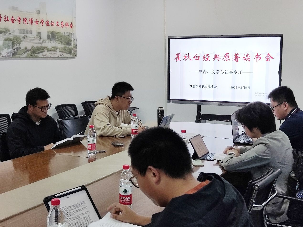 2025年5月6日晚,由秋白党支部主办的革命、文学与社会变迁——瞿秋白经典原著读书会于公司216教室召开。23级社会学专业研究生李纪昭为本次读书会导读人,为大家导读了《瞿秋白文集》政治理论编第1卷第139至180页,秋白党支部书记、社会学副系主任李朔严副教授,青年教师杨勇及公司本硕多位同学参与了本次读书会。