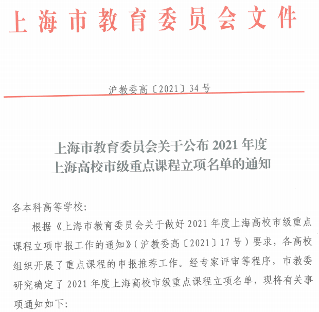 2021年4月,公司根据《上海市教育委员会关于做好2021年度上海高校市级重点课程立项申报工作的通知》(沪教委高【2021】17 号)和公司《关于开展2021年度校级和上海高校市级重点课程立项申报工作的通知》(教务部【2021】8号)的要求和精神,积极组织开展重点课程申报推荐工作。经个人申报、公司推荐、公司审核推荐、专家评审等程序,两门课程入围2021年度上海高校市级重点课程立项名单。