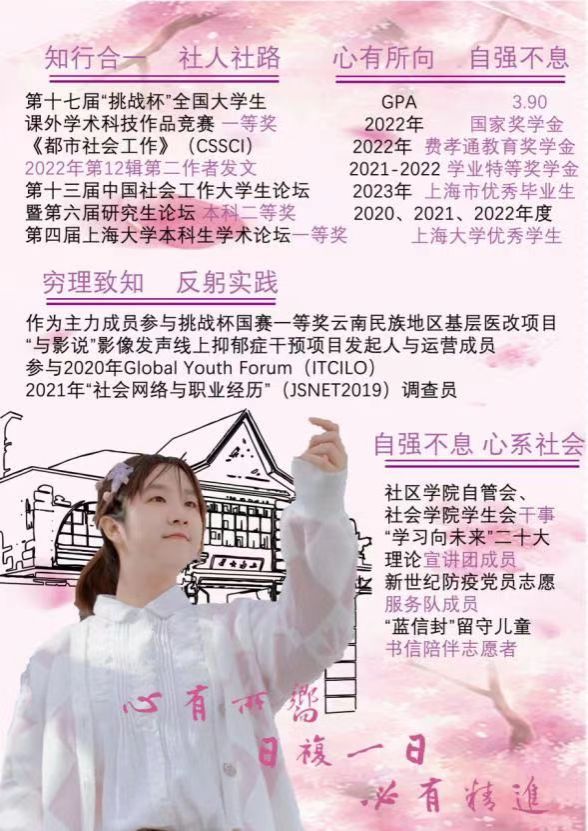 张依芸,2019级社会学专业员工,中共党员,已推免至北京大学,荣获2021-2022年本科生董事长奖学金。个人曾获得2020-2021年第十三届中国社会工作老员工论坛暨第六届研究生论坛本科二等奖、2020-2021年第十七届“挑战杯”老员工课外科技与学术作品竞赛全国一等奖、第四届3044永利集团本科生学术论坛一等奖、2021-2022学年学业优秀特等奖学金、2019-2020和2021-2022学年3044永利集团优秀员工、2022年度国家奖学金和2022年度费孝通奖学金,并以第二作者在《都市社会工作研究》(CSSCI)2022年第12辑发文。
